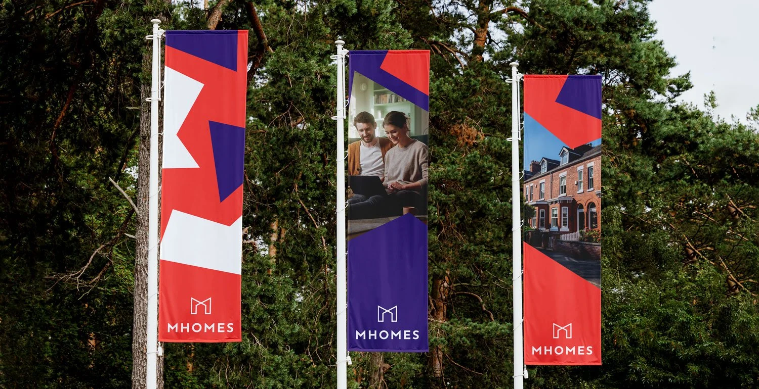 Below are some examples of the brand applied to hoardings, flags and the brand styleguide