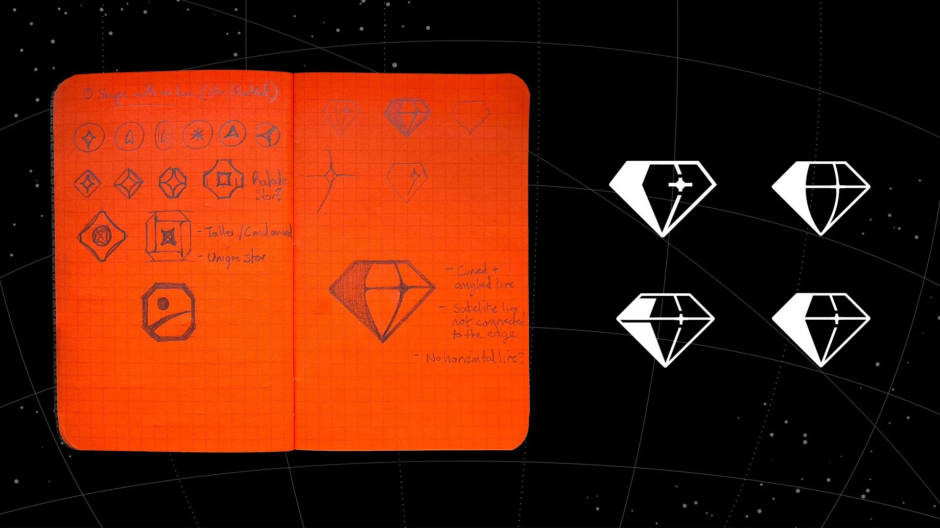The design that stood out to me the most involved a gem (often used to represent branding) with a small satellite like icon that’s also combined with a line on the gem.