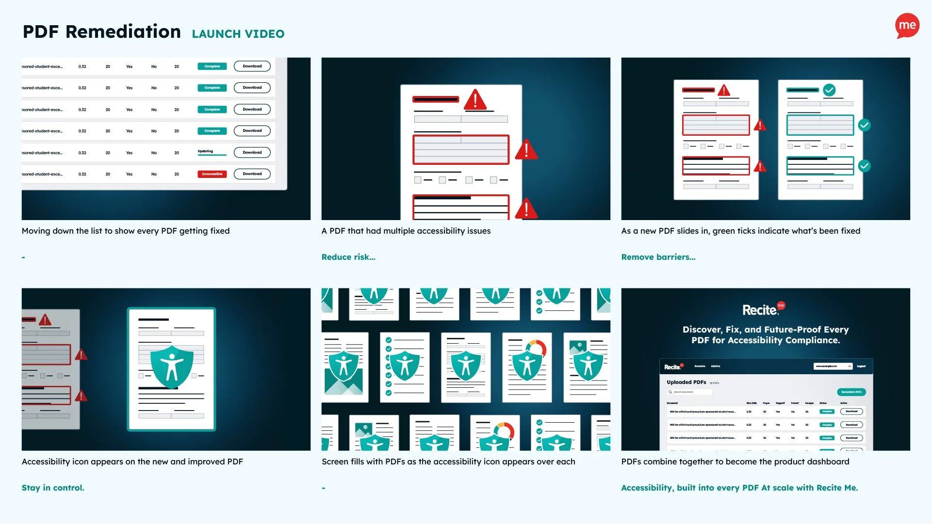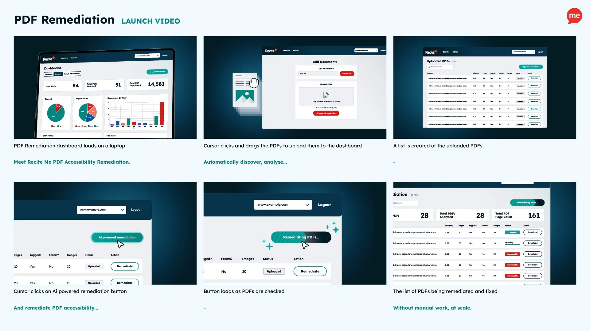 A launch video advertising one of Recite Me’s latest products, PDF Remediation. The video highlights the issues around inaccessible PDFs, and shows how this new product can quickly solve these accessibility issues at scale.