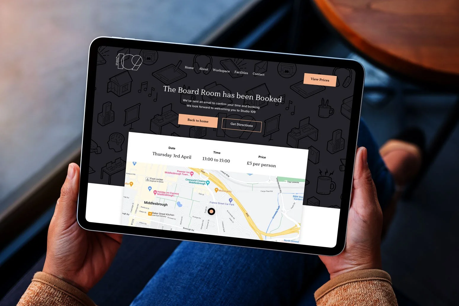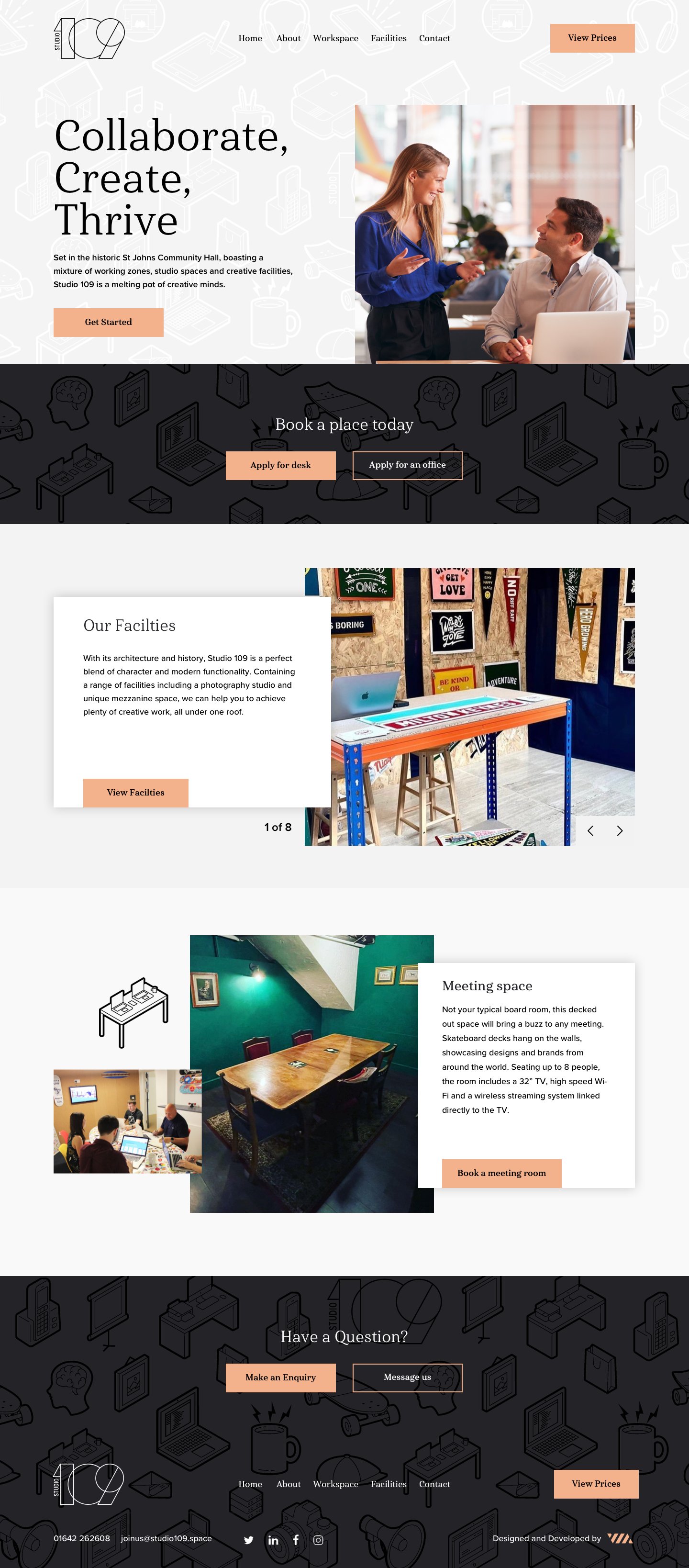 Extensive wireframes were created to help shape the structure of the new Studio 109 website. Utilising the colour palette from the branding, the new colour scheme helped establish a look and feel. The website would also include a booking system for the meeting rooms and photography studio. Which would show a calendar view with the available and booked slots.
