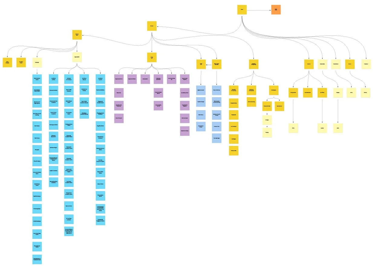 Following the project discovery and immersion session the sitemap was created the establish the breadth of the service offering. The new website would be a combination of property, injury and solicitors website, plus would need to include a section for help and advice.